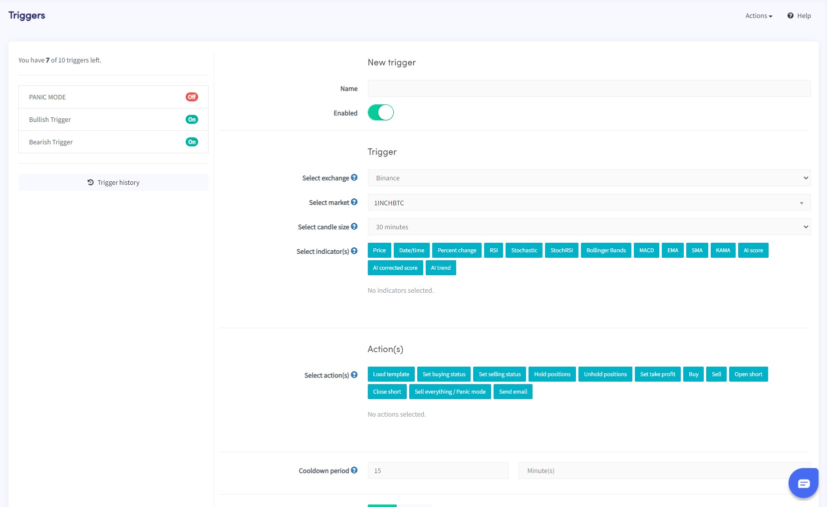 Triggers allow you to build safety nets or to enable automatic actions for your Hopper. For example, you can create a trigger that switches your Hopper on/off when certain criteria are met. You can even create a (very strict) trigger that enables to sell everything - Panic Mode when a crash occurs or when there is on a larger time frame confirmation the market enters for a longer period of time a bearish sentiment. This can be useful for people with high exposure of their funds.